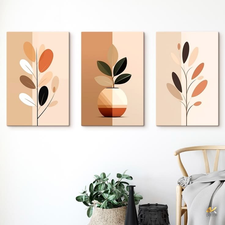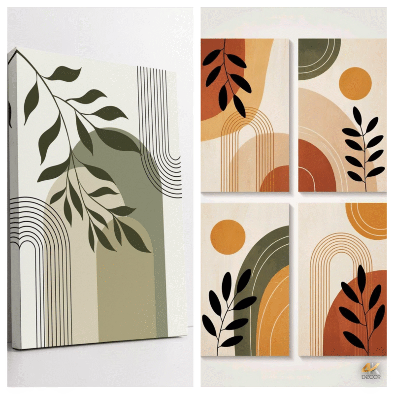 Lá cây, cành hoa, hay cây xương rồng được vẽ bằng đường nét đơn giản trên nền trắng — botanical minimalism là phong cách đang “cháy hàng” tại các cửa hàng nội thất Scandinavia. Loại tranh này mang sự mềm mại, gần gũi thiên nhiên vào không gian mà không cần phải chăm sóc cây thật. Kết hợp với tranh canvas phòng khách cho không gian xanh mát cả ngày.