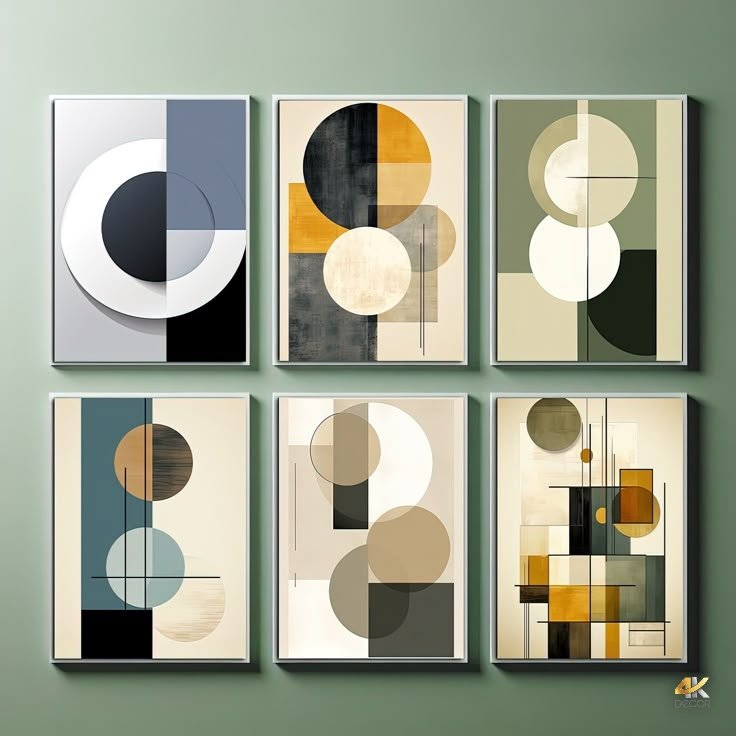 Các hình khối hình học đơn giản — vòng tròn, tam giác, đường thẳng — được sắp xếp cân đối tạo thành bố cục tranh tối giản hình học. Màu sắc thường là 2–3 tông: nền trắng/be + 1 màu accent (đỏ gạch, xanh navy, vàng mù tạt). Phù hợp với phòng theo phong cách Mid-Century Modern hoặc Contemporary.