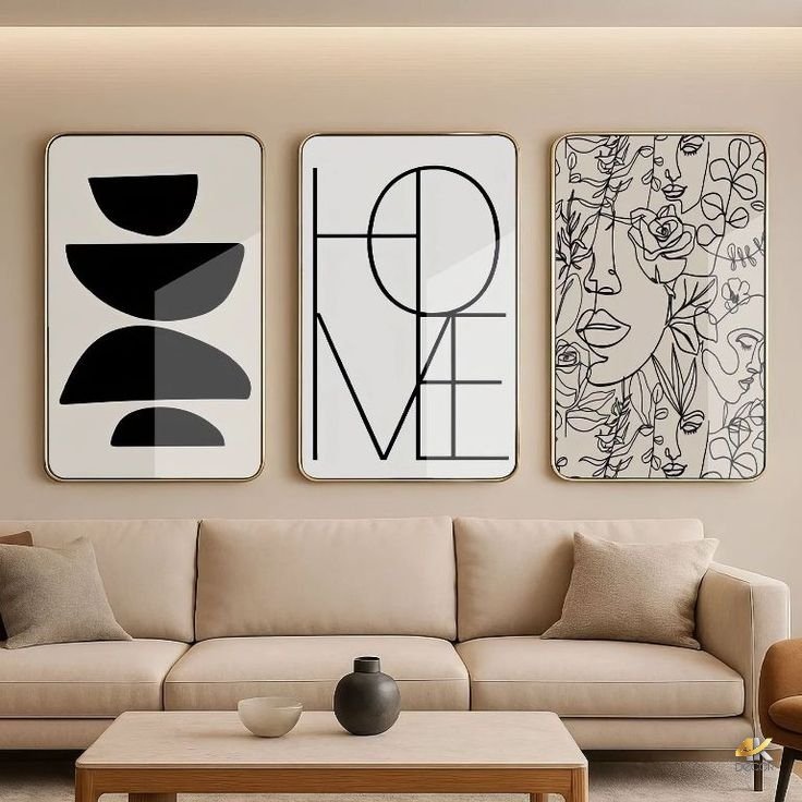 Gợi ý bố cục: Treo 3 tranh line art cùng series theo chiều ngang, khoảng cách đều nhau 5–8 cm, trong khung mỏng màu đen hoặc vàng đồng.