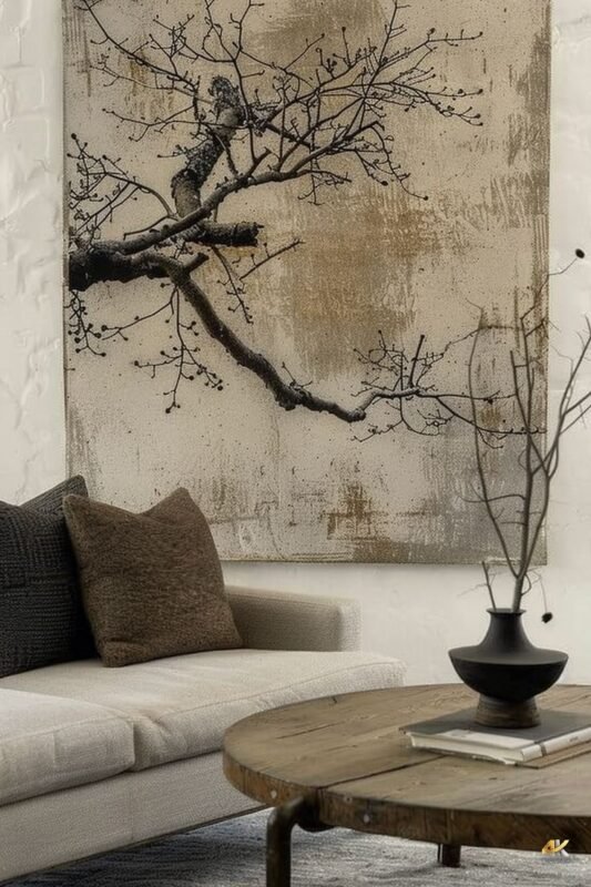 Wabi-sabi là triết lý thẩm mỹ Nhật Bản đề cao vẻ đẹp của sự không hoàn hảo và thoáng qua. Tranh wabi-sabi thường có màu sắc đất (ochre, terra cotta, rêu xanh), hình ảnh thiên nhiên giản dị như đá cuội, tre trúc, hay cành khô. Phong cách này phù hợp nhất với không gian Japandi hoặc nhà theo phong cách rustic.